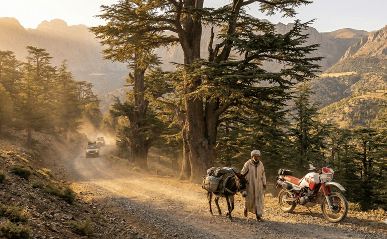 Día 2 Domingo 11 octubre. Primer día de ruta africana real. Pistas espectaculares entre árboles, bosques del norte y, con suerte, algún mono curioseando. Subimos por encima de los 2.000 metros hasta Imilchil, pequeño pueblo bereber. El couscous de esta noche se os quedará en la memoria.