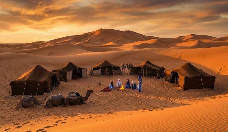 Día 5 Miércoles 14 octubre. : pistas rápidas y arena. Visitamos la antigua prisión portuguesa (escenario de anuncios por su belleza brutal) y seguimos hasta Merzouga.Dormimos en jaimas equipadas con ducha y baño. Llega la comida de familia: cada participante trae productos de su tierra y lo compartimos todo. Una mesa larga en mitad del desierto donde ya somos tribu.